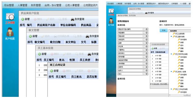 平台提供人事管理、财务信息管理、公文管理、合同管理、资产管理、停车场管理、采购管理、库存管理和客户管理等专业管理功能,提供部门管理、角色管理、权限管理和用户管理等基础管理功能。