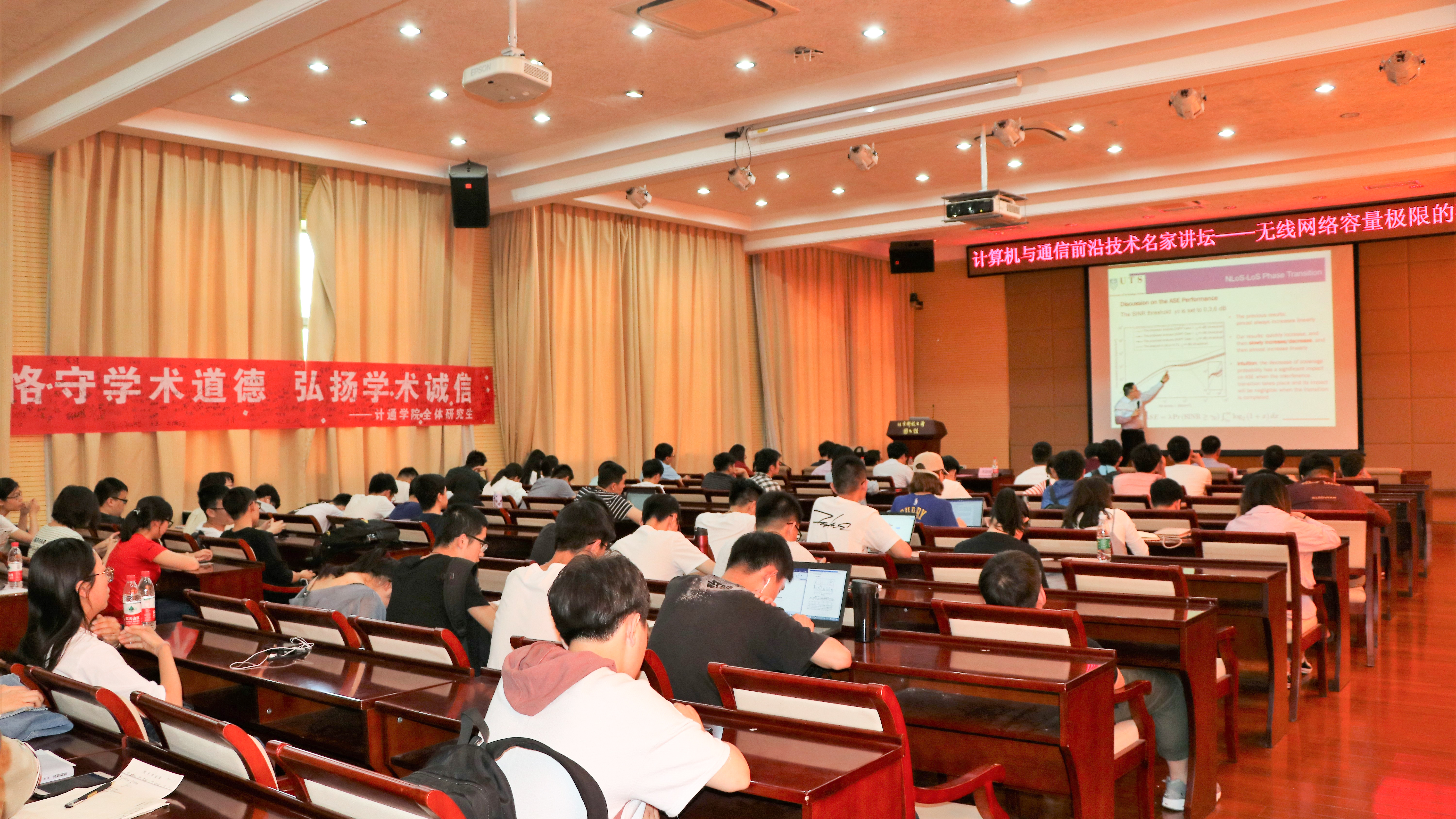 启动仪式结束后,毛国强教授作题为《无线网络容量极限的研究》的报告,这次报告中,毛教授介绍了所在团队最近在预测库珀定律结束和无线容量增长极限这一方面的研究,从关于库珀定律什么时候结束、可能导致库珀定律终结的原因、如何延长库珀定律寿命的三个关键方面作出了详细阐述,到场同学受益匪浅,了解了前沿知识。