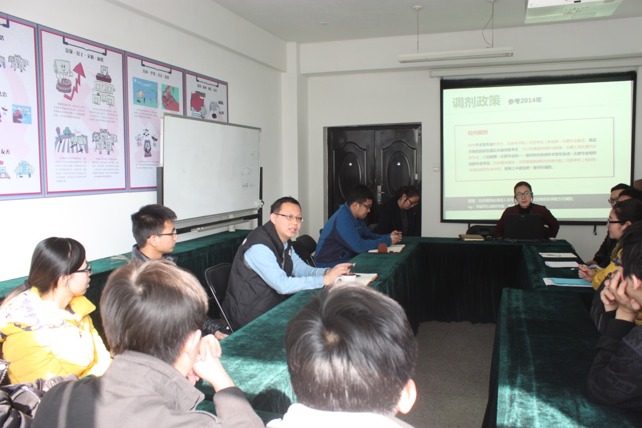 考研学生调剂去向以及近段时间学校学院的各类调剂信息。会上,几位老师对往年同学调剂的基本流程以及方法做了详细的阐释并为同学们解读了调剂的基本注意事项,帮助大家寻找理想的调剂学校,苏栋老师用具体数据说话,详细的向同学们介绍了近几年博彩评级网