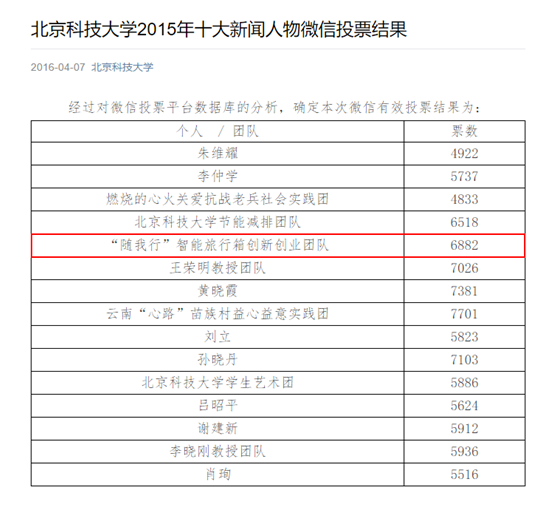 2016年4月7日,靠谱的博彩平台 2015年十大新闻人物结果公布,博彩评级网 王洪泊副教授“随我行”智能旅行箱创新创业团队成功入选。
