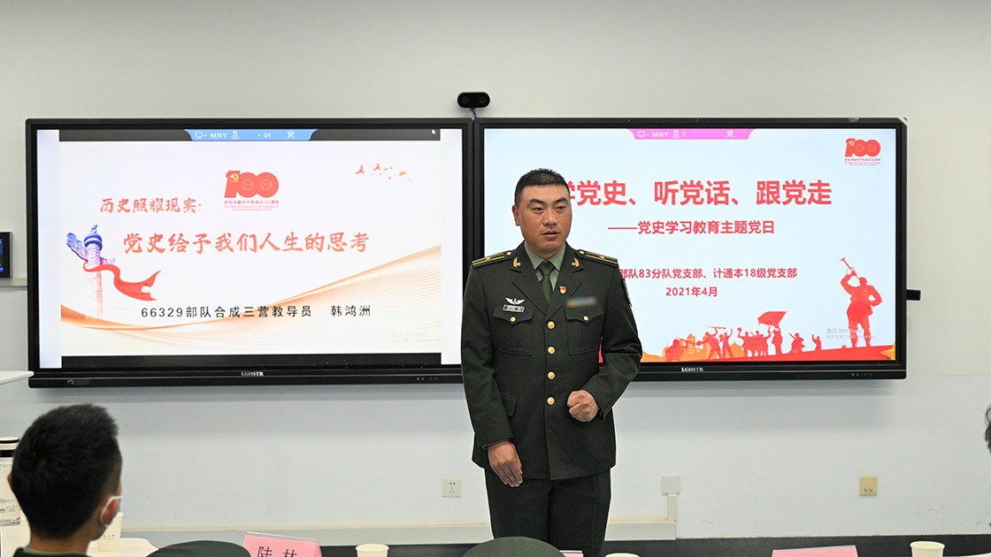 党史学习教育开展以来,博彩评级网 高度重视,精心部署,创新落实,态势良好。为深入推进党史学习教育及红色“1+1”活动,博彩评级网 本18级党支部于4月30日在机电信息楼617开展“学党史、听党话、跟党走”支部共建主题党日活动。共建部队教导员韩鸿洲,083分队指导员陆林,博彩评级网 党委副书记、副院长田斌参加本次活动。本18级党支部书记刘晗主持。